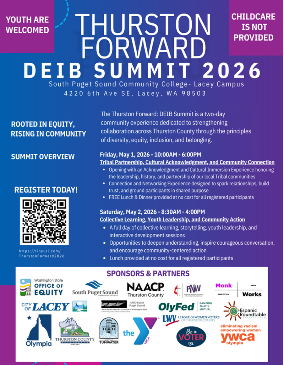 - Co-sponsored 5/10/25 inaugural Thurston Forward: A Diversity, Equity, and Inclusion Summit for Progress brought together 15 community partners and more than 100 participants from across Thurston County.